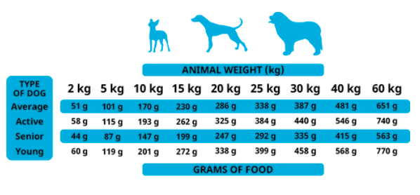 Consulte la tabla de necesidades diarias de alimento como punto de referencia, variando la cantidad de alimento según la edad, nivel de actividad física, peso o raza.