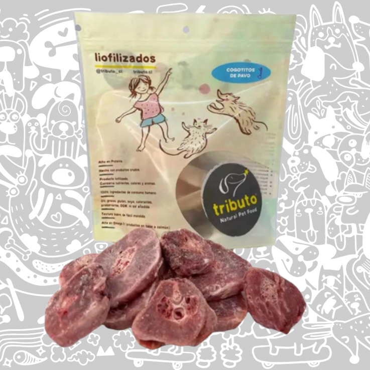 Tributo Snack Crudo Cogotitos de Pavo es un delicioso y saludable snack de cogotitos de pavo crudos liofilizados. Ideal para complementar la dieta BARF o para dar un snack saludable y lleno de nutrientes.