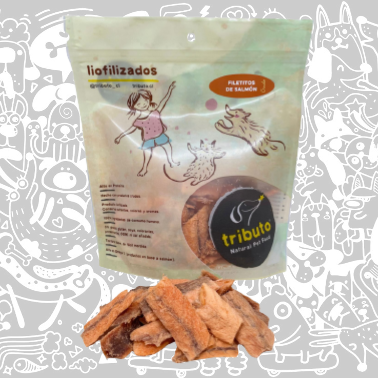 Tributo Snack Crudo Filetitos de Salmón es un sorprendente snack para regalar a tu mascota, 100% a base de filete de salmón crudo liofilizado. Elaborado a base de salmón libre de antibióticos ya ser crudo liofilizado mantiene todas sus propiedades. Puede partirse fácilmente para adecuarse al tamaño requerido por cada perrito o gatito. Buena fuente de Omega 3.