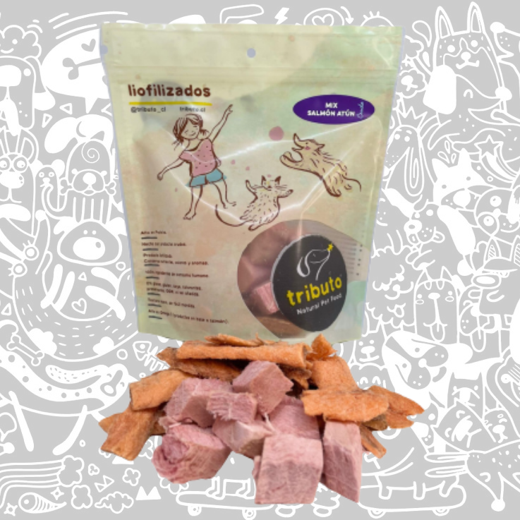 Tributo Snack Crudo Mix Salmón Atún es un sorprendente snack para tu perrito con esta deliciosa mezcla de Salmón y atún. Esta mezcla está elaborada solo con trozos crudos liofilizados de salmón y con un grado de consumo humano y sin antibióticos. Buena fuente de Omega 3.